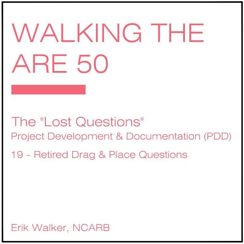 Over the years, the exams presented by NCARB have evolved. From reducing the total number of exams in the move from ARE 4.0 to ARE 5.0; to changing the format; to changing the types of questions; to changing the total number of questions; the exams have seen substantial changes. The first such change to the 5.0 Exams reduced the total number of questions in each exam while increasing the amount of time a tester has to complete that exam. The second change removed all of the quantitative-fill-in-the-blank style of questions, and this latest change resulted in the removal of the Drag and Place questions.